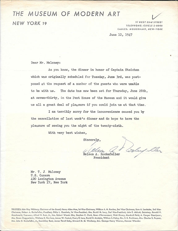 ROCKEFELLER, Nelson A. (1908-1979). Vice-President of the United States (1974-77). Governor of New York. T.L.S., 6/12/1947 on the imprinted stationery of The Museum of Modern Art, New York. Fine letter regarding a dinner for Captain Steichen at the penthouse of the museum.. Very good condition...............$95.00 |
