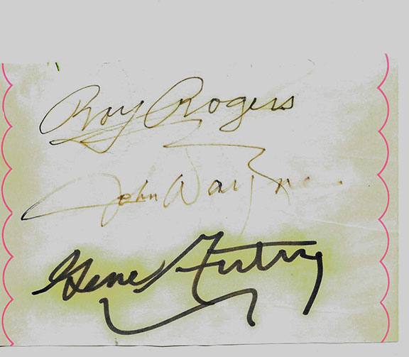 AUTRY, Gene (1907-1998). American actor, composer, singer and musician. Inducted into the Country Music HOF. On a large slip, measuring 4”x6” the three have signed their names. Wayne had a little problem with his pen where the bottom of the “y” and the “e” at the end is lighter than the rest of the signature but still readable. In very good condition and quite scarce to have all three on the same item .............$575.00
