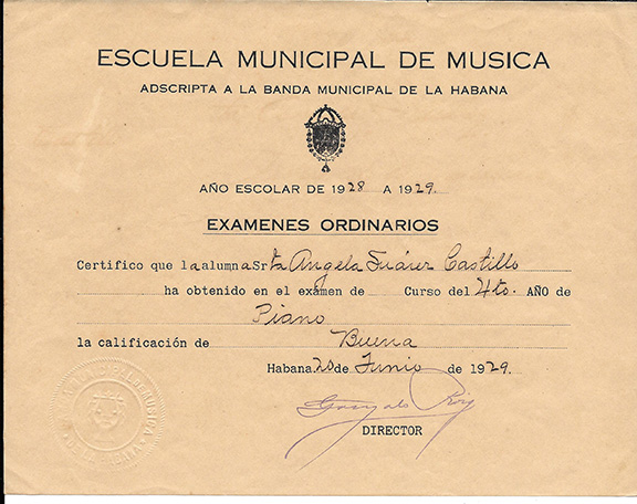 Partly printed document signed, one page, measures appx. 7”x9”. Titled “Escuela Municipal De Music” dated Habana 1929. A certificate issued to a student of the piano. Signed by Gonzalo Roig as Director. Very good condition and autographs of Roig are not common..............................$225.00