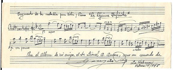 AMuQs, Roig has penned two lines of music to his big hit “La Lagrima Infinita” (The Infinite Tear) on printed music paper measuring appx. 3.75”x9". He has identified the music and inscribed, signed and dated this piece: “La Habana, Febrero, 14/1945” (on Valentines Day). A very desirable piece and in fine condition...............$495.00