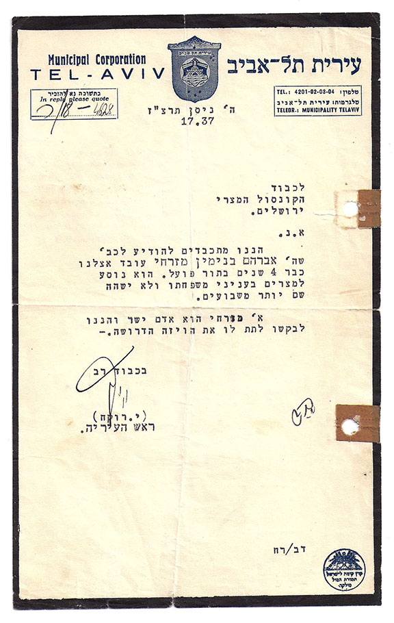 ROKACH, Yisrael (1896-1959). A member of the Tel-Aviv City Council from 1922. Deputy Mayor in 1927 and Mayor from 1936-1953. Last Tel-Aviv Mayor under British rule. General Zionist member of the Knesset from 1949. Minister of the Interior from 1953-1955. Fine typed letter signed, one page, on the imprinted stationery of the Municipal Corporation, Tel-Aviv, 1937. Signed in Hebrew as Mayor. Near fine condition except for two file holes in the right margin..................................$37.50