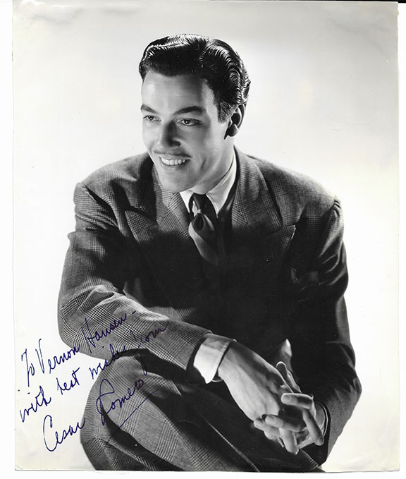 ROMERO, Cesar (1907-1994). American actor, singer and dancer. Appeared in films, TV and radio for almost 60 years. Photograph, B&W, borderless, 7.25”x9”, youthful image, three quarter length pose dressed in a suit and tie. He played the Joker in Batman series (1966-1968). Inscribed and signed: “To Vernon Hanson with best wishes from Cesar Romero.” In very good condition.....................$67.50![]() |