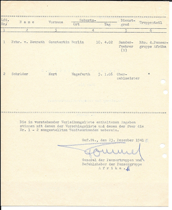 ROMMEL, E. (1891-1944). German Field Marshall, known as “The Desert Fox.” At one time Hitler’s favorite General. Commander of the Panzer Division that smashed the French defenses (Blitzkreig). Hitler charged Rommel with high treason, his house was surrounded and two Generals delivered poison to Rommel. He was given the chance to die by poison. This would be covered up as he was promised a state funeral. Wonderful, important Christmas appointment of Frhr Constantin von Neurath, SS Specialist to be Commando of the Panzer Group in Africa. Dated 23 Dec. 1941. Approved and boldly signed by Rommel. Later on, von Neurath sent Hitler hair raising details from Sicily stating the people hated German troops. Usual four file holes in blank margin otherwise fine . Rommel’s signature is four and a half inches long...................... $1,950.00