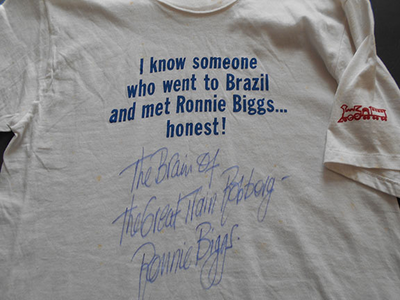 Printed in bold blue letters on the front: “I know someone who went to Brazil and met Ronnie Biggs...Honest!” On the left sleeve is a printed two car train, in red. Below the printing on the front Biggs has written, at my request in person: “The brain of the great train Robbery, Ronnie Biggs.” In very good condition, some light tan spots from storage. A fabulous item for framing. Would look wonderful in a UK pub or museum.................$350.00