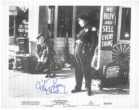 ROONEY, Mickey (1920-2014). American actor, his career spanned over 9 decades. He appeared in over 300 films. Rooney was one of the last surviving stars of the silent film era. He was the top box office attraction from 1939-41. Fabulous movie still from “The Fireball.” Mickey is trying on skates as aa policeman looks on. Boldly signed. This comes with a COA from a private signing in Hollywood..............................$55.00 |