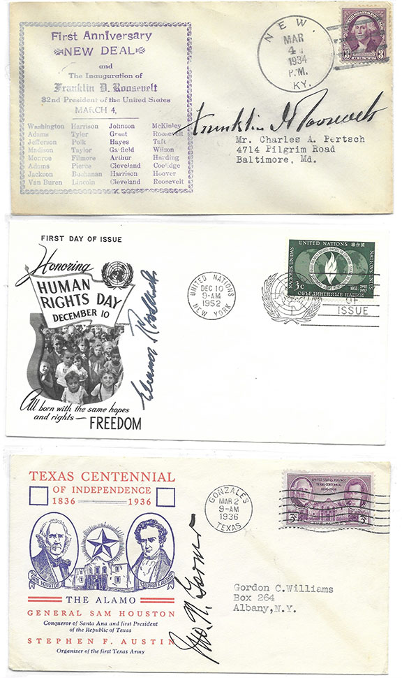 2) ROOSEVELT, Franklin D. (1882-1945). 32nd President of the United States (March 4, 1933-April 12, 1945). Cover commemorating the First Anniversary of the New Deal and The Inauguration of Franklin D. Roosevelt. Cachet lists all 32 Presidents of the U.S. Affixed to this cover is a U.S. 3 cent postage stamp cancelled New Ky. Mar 4, 1934. Roosevelt signed with a wonderful, bold signature and as close to a franking signature which you may never see. The only “Franks” we have seen are those done by FDR as a special present. Together with two covers, one of the Texas Centennial, 1936 signed by Vice President John Nance Garner and the other a FDC Honoring Human Rights Day, 1952 signed by Eleanor Roosevelt. The three are in fine condition. From the Estate of Ralph Swap of Alaska...........$950.00