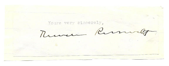 ROOSEVELT, Theodore (1887-1944). Son of President Theodore Roosevelt. Brigadier General who died on the beach of Normandy. He helped form the American legion in 1919, Governor of Puerto Rico (1929-1932). He led the first troops at Utah Beach during the landing at Normandy. He is the recipient of the Medal of Honor. Choice full signature at the bottom of a letter, affixed to a larger slip. His signature is 4.5” long...............$95.00