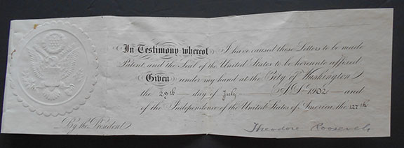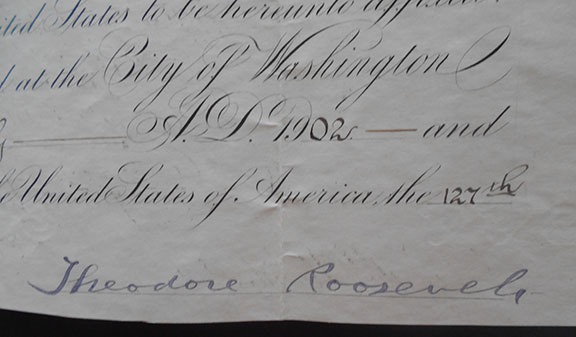 ROOSEVELT, Theodore  (1858-1919). 26th President of the United States (1901-1909)  Fine portion of a presidential document complete with a large paper seal. Dated, Washington 29 July 1902 and signed in full with a signature nearly five inches long. A fabulous display piece