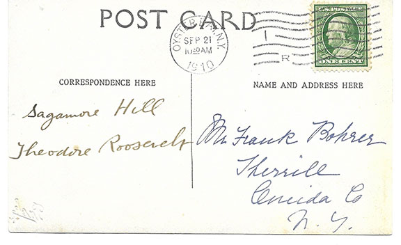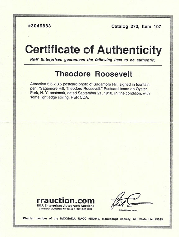 ROOSEVELT, Theodore (1858-1919). Twenty-sixth President of the United States. Roosevelt was Governor of New York and Assistant Secretary of the Navy under President McKinley. Roosevelt was an author, explorer, historian, and soldier. In addition, he was awarded the Nobel Peace Prize in 1906. He was also the president who named the president’s home, White House. Previously, it had been called The Executive Mansion. Later he changed the name of White House to The White House. Oct. 1910, he was the first U.S. President to fly in an airplane. A year after leaving The White House he went of safari to Mombasa, the Belgian Congo where his team killed and trapped 11,400 animals. Roosevelt’s face is included in the Mount Rushmore memorial. He is the only president to receive a Medal of Honor. A very rare postcard of his home “Sagamore Hill in Oyster Bay, New York. Most interesting it was mailed to a collector with a U.S. One Cent postage stamp. A circular postal cancellation “Oyster Bay, N.Y. Sep 21, 1910.” In the correspondence area of the post card, Roosevelt has signed his name, in full, adding “Sagamore Hill.” This was his home since 1885 until his death. It was also used as the “Summer White House (1901-1909). The first signed card of this type we have seen, In fine condition. Together with a COA from RR Auction.....SOLD