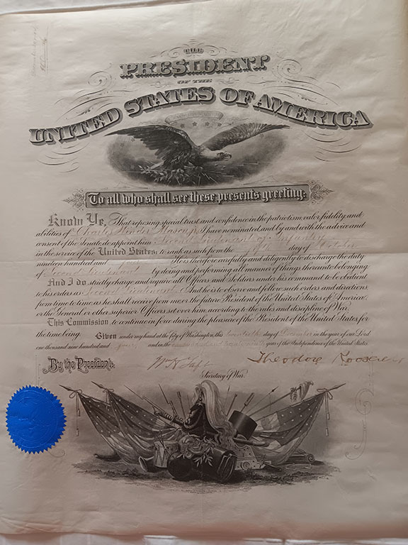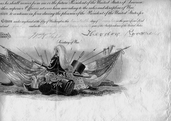 TAFT, William (1857-1930) The 27th President of the United States (1909-1913). Chief Justice of the Supreme Court of the United States. Very desirable vellum document signed, appointing Charles W. Mason, Jr. a Second Lieutenant of Infantry from the 5th Day of October 1904. Signed by Theodore Roosevelt with a signature 5.5” long and counter signed by Wm. H. Taft as Secretary of War. War Department seal intact and document if fine condition.........$2250.00