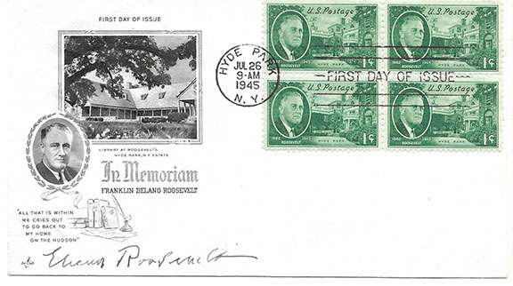 ROOSEVELT, Eleanor (1884-1962). First Lady (1933-1945). Author, diplomat, activist and pacifist. First day Cover commemorating the passing of President Franklin D. Roosevelt. Nice cachet of FDR and his home in Hyde Park, N.Y. Affixed are 4 one cent FDR postage stamps cancelled First Day of Issue, Hyde Park. July 26, 1945. Signed by Eleanor Roosevelt..................$185.00