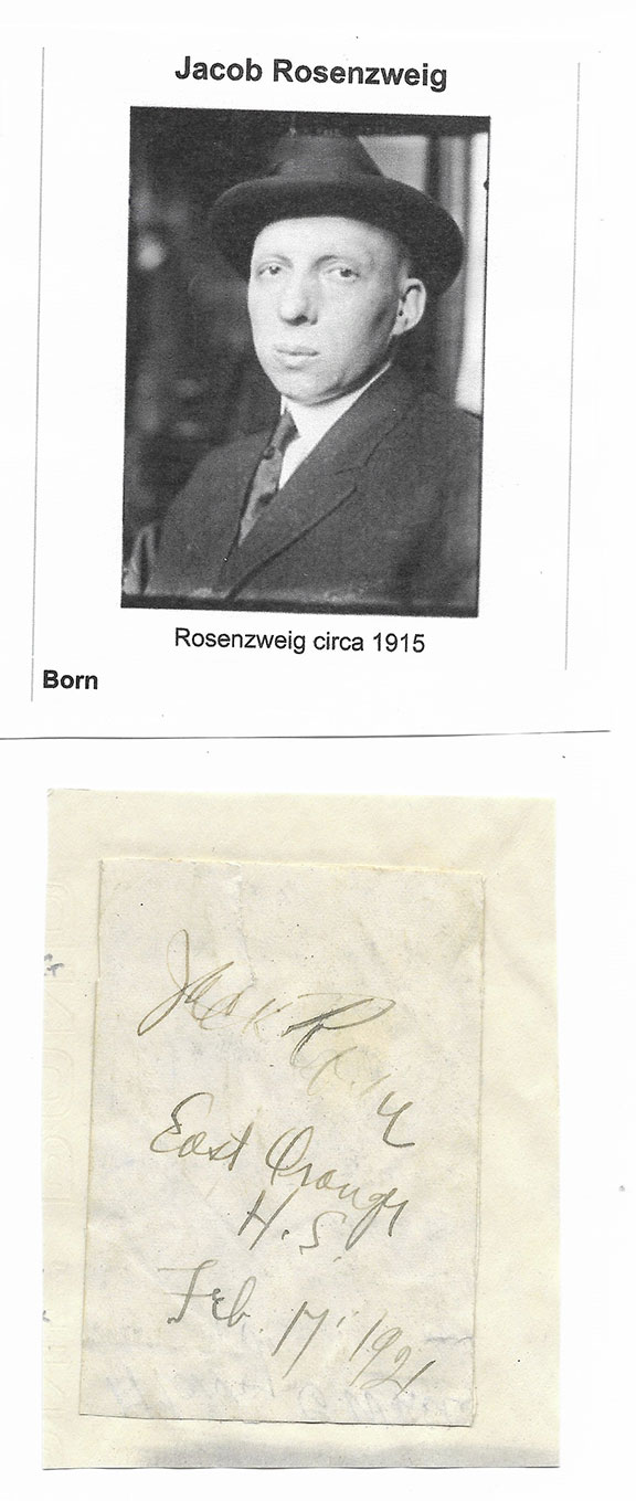 ROSE, Jack (1875-1947) Born Jacob Rosenzweig. American gambler, nickname Bald Jack Rose. He founded the “Rosebuds” early minor league baseball team in the Connecticut League. Owner of a palatial gambling establishment in New York City known as “The Rosebud” a known underworld hangout. The cocktail “Jack Rose” named in his honor which was very popular during the 1920’s. In Ernest Hemingway’s 1926 classic “The Sun Also Rises” the narrator drinks a “Jack Rose” cocktail in Paris. Lt. Charles Becker of the “Gambling Squad” raided “The Rosebud.” In exchange for not closing it down Rose agreed to pay 25% of his weekly income. In 1912, Becker went on trial for murder of Herman Rosenthal, a notorious gangster and gambling house operator. Rosenthal was known as “The Jewish Gangster and Jewish Mafia.” This was the most sensational murder case New York had ever seen. Jack Rose turned states evidence and Becker was electrocuted (1915). Rose later reformed and became an expert poker player. He was offered $30,000 to write a book on poker but refused. He toured the United States in clubs and schools lecturing against gambling to boys. Slip affixed to a larger page where Jack Rose has signed his name adding East Orange H.S. Feb 17, 1921.” A very scarce/rare signature................$175.00