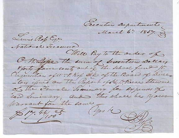 ROSS, John (1790-1866). Indian name was Coowescoowe. American Indian Chieftain who served with Andrew Jackson against the Creeks (1812). In his tobacco business he held 20 enslaved African Americans. President, National Council of Cherokees (1819-1826); resisted policy of moving the Cherokee Nation to Indian Territory. He is known as the “Cherokee Moses” who led his people in their exodus from their land. In 1838 Ross’s wife died while emigrating on the Trail of Tears. Later he signed a treaty with the Confederacy. Ross as Chief made several trips to Washington and had meetings with President Lincoln. Ross was Chief of the United Cherokee Nation (1839-1866). Manuscript document signed, one page, oblong, Executive Department, March 6, 1857. To the National Treasurer Lewis Ross. Chief Ross authorizes payment of $17.44 to O. Liepe from the general school fund for work as a Steward in the Female Seminary. Near fine condition............. $1875.00