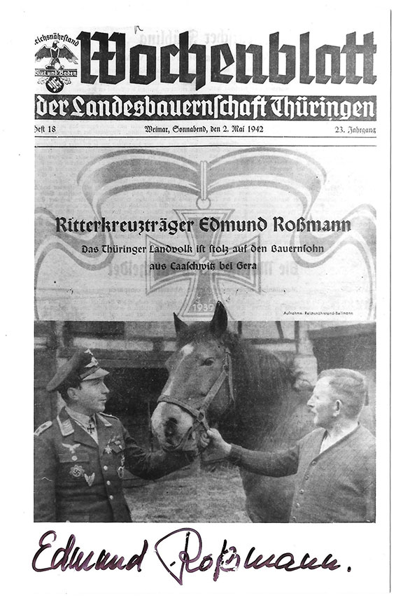 ROSSMANN, Edmund (1918-2005). German fighter pilot in WWII. Ace credited with 93 victories. Last Lieutenant of the German Air Force in WWII. Considered the mentor of Eric Hartmann. Prisoner of War released in 1949. Photograph 5”x7” B&W of Rossmann in uniform looking at a horse. Appears to be taken from a front page of a war time newspaper. Boldly signed with his full signature on the lower white margin. Not common. In fine + condition............................... $85.00 |