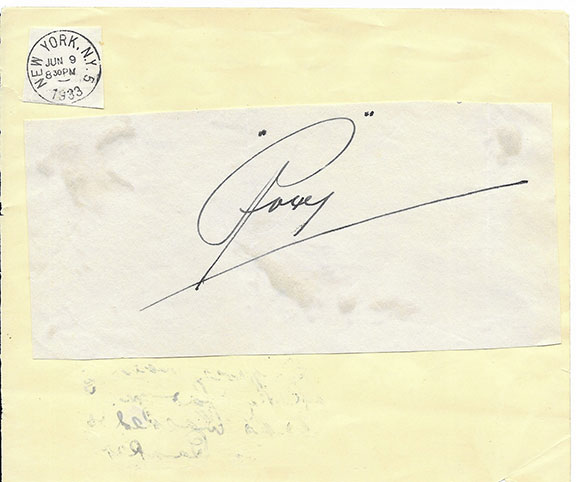 ROTHAFEL, S.L. (1882-1936). N.Y. Entrepreneur, theatre owner of Roxy Theater in NYC. Many movie theatres were designed by architect Rothafel..As an architect he built Radio City Music Hall, one of the greatest art deco structures ever built. It opened Dec. 20, 1932 featuring the Roxyettes. He was the impresario for many of the great movie palaces such as the Capitol, The Strand, Rialto, Rivoli and his self-named Roxy Theater in New York City. He was one of the greatest showmen of the 1920’s and silent screen era. Roxy is credited with many movie innovations including syncing orchestral music to movies in the silent screen era. Fabulous large signature “Roxy” on a slip with attached postmark New York N.Y. June 9, 1933...........$125.00