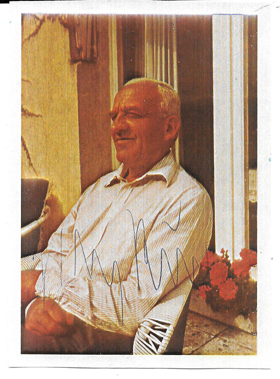 RUDEL. Hans-Ulrich  (1916-1982). German fighter pilot in WWII.  Flew 350 missions destroying 500 Russian tanks. Credited with 11 aerial victories. Color portrait taken in Vienna during the 1970’s. Measures 4”x5” sitting in a chair out doors and smiling. Signed with very good contrast. In fine condition..
