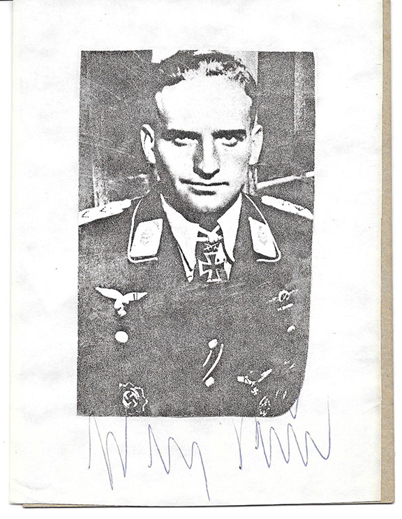 RUDEL, Hans-Ulrich (1916-1982). Stuka Pilot, flew 350 missions and destroyed over 500 Russian tanks and credited with 11 aerial victories. Hitler’s most decorated pilot. Hitler had a special Knight’s Cross made for him a Knight’s Cross with Golden Oak Leaves with Swords and Diamonds. Copy of a photograph, half length pose in uniform. Affixed to a large page and signed below with an excellent signature.................SOLD