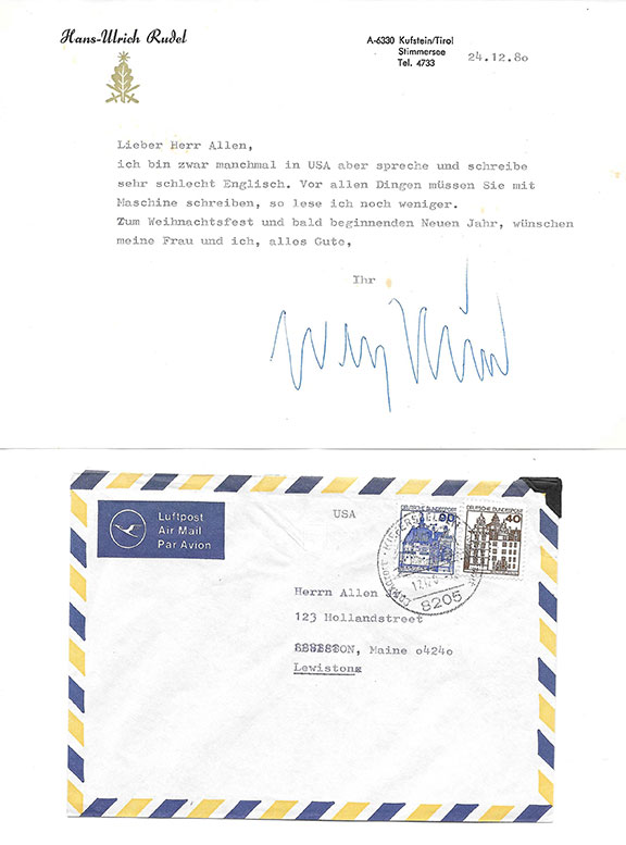 RUDEL, Hans-Ulrich (1916-1982). Stuka Pilot, flew 350 missions and destroyed over 500 Russian tanks and credited with 11 aerial victories. Hitler’s most decorated pilot. Hitler had a special Knight’s Cross made for him. T.L.S. on his name imprinted stationery. 12/24/1980 to a Mr. Allen in Maine. In German but translated: “I am sometimes in the United States, but I speak and write very bad English. Particular you have to write with a typewriter so I can read even less. For Christmas and the upcoming new year I wish you and your wife the very best. Yours, Hans-Ulrich Rudel.” Together with the original envelope.................$350.00