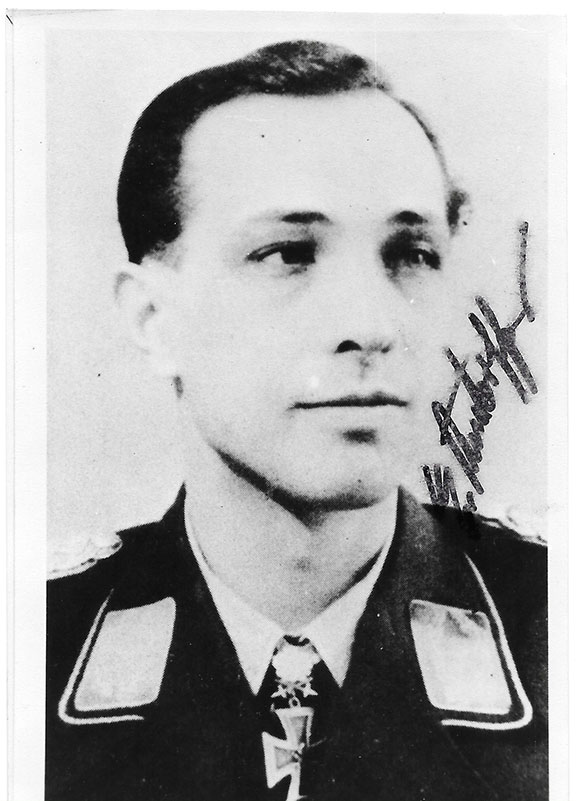 RUDORFFER, Eric (1917-2016). German fighter pilot who flew in the Battle of Britain. Seventh highest scoring Ace credited with 222 victories with 13 in one day. He was awarded the Knight’s Cross with Oak Leaves and Swords. Photograph, 4”x6”, head and shoulders pose, full face in uniform. Boldly signed with excellent contrast. Very minor smudging to signature............................. $95.00 |