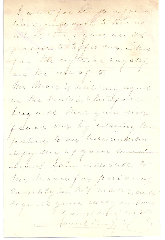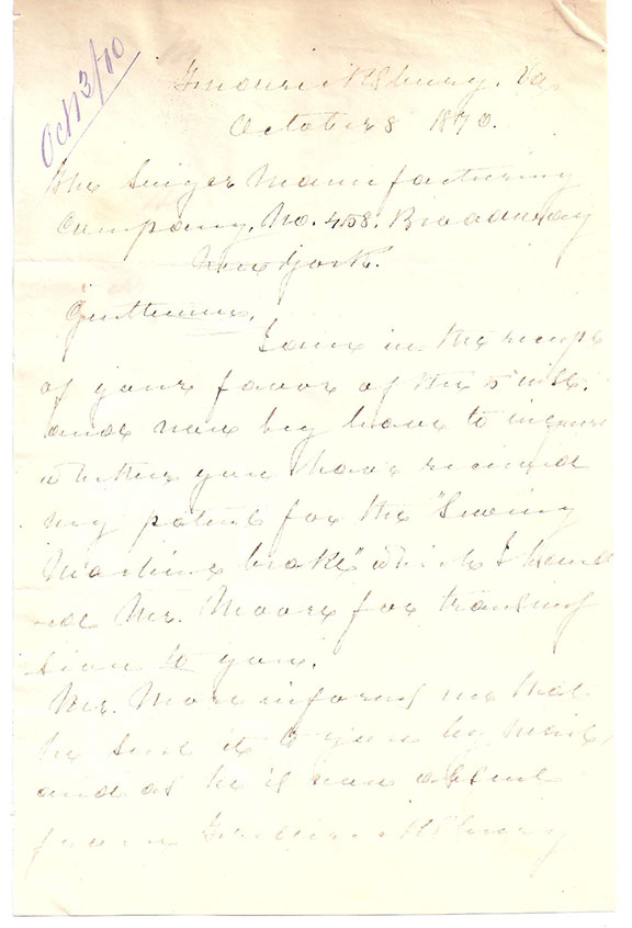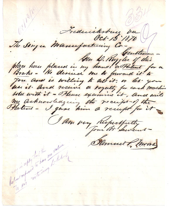 RUGGLES, Daniel (1810-1897). Confederate Brigadier General, West point graduate. He led Bragg’s First Division at Shiloh and caused the surprised Union General Prentiss to surrender. Commanded the Department of East Louisiana at Jackson, MS. Autograph letter signed, 2 pages, Fredericksburg, VA, Oct. 28,1870. Ruggles writes to the Singer Manufacturing Co. in New York asking them if they have received his patent for the “Sewing Machine brake”. He continues to ask about rights and royalties. He also requests the return of the patent. Together with an A.L.S. from Samuel Moors to the singer Manufacturing Company sending them the patent at the request of Gen. Ruggles and asking to be advised of their interest. A note at the bottom of the letter in an unidentified hand states the company has no interest and the patent has no value to them. Interesting collection and of what the general was doing after the war. General Ruggles used a pen with a fine point and the writing is a bit light but very readable...................... $550.00