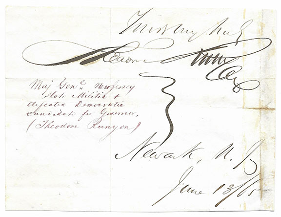 RUNYON, Theodore (1822-1896) Brigadier General in the Union Army during the Civil War. He was one of the first to respond to President Lincoln’s call for 757 men. He commanded a brigade that went to defend the capitol of our nation. During the first tattle of Bull Run he received a special commendation for commanding his division during the advance towards Manassas Junction. Fort Runyon named in his honor. Later he became Mayor of Newark, New Jersey. Fabulous ornate signature from the bottom portion of a letter adding: “Newark, N.J.. June 13/65.” Short five line biographical note on the left side...............$35.00