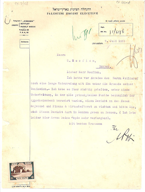 RUPPIN, Dr. Arthur (1876-1943). Zionist leader, economist, founder of various settlement companies of the Zionist Organization including the Palestine Land Development Company. Appointed Director of Zionist Executive’s Colonization Department in Jerusalem. Author of many books. Typed letter in German, signed, one page on the imprinted stationery of Palestine Zionist Executive. Dated 9 July 1922. A nice early example, signed in English. Two file holes in the left margin otherwise very good..................................SOLD