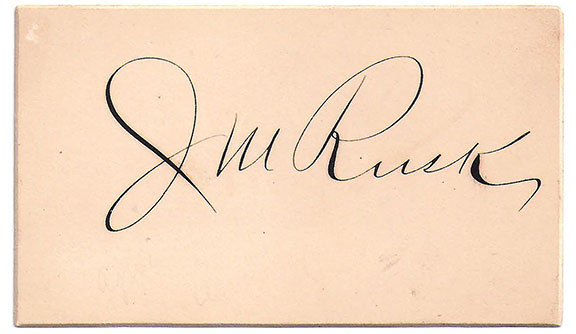 RUSK, Jeremiah McLain (1830-1893). Brevet Brigadier General USV 25th Wisconsin. Commanded a regiment in Sherman’s Meridian Campaign. He also fought in the Atlanta Campaign. Governor of Wisconsin (1882-89). Served first full term as Secretary of Agriculture under President Benjamin Harrison. Fine bold signature on a large slip..............................SOLD |