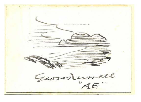 RUSSELL, George W. (1867-1935) Pseudonym (A.E.) Irish man of letters, artist, editor of The Irish Homestead. Author of many books. Original sketch, in ink, on a small card of water, a beach and mountains, Signed with his double signature. Quite uncommon......................$125.00 |