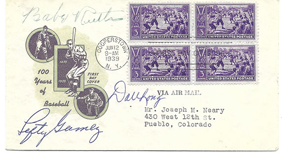 GOMEZ, Lefty (1908-1989). Left-handed pitcher who played baseball (1930-1943) Five-time World Series champion with the Yankees. All star every year from 1933 to 1939. Elected into the Baseball Hall of Fame in 1972. Fantastic cover commemorating 100 Years of Baseball. Cachet of a pitcher, batter, and catcher, First Day Cover. Affixed is a block of 4 Centennial of Baseball postage stamps cancelled Cooperstown, June 12, 1939. Hand signed by all three. Notations in ink on verso: “Babe Ruth autograph July 7, 1940. Vernon (Lefty) Gomez November 5, 1964. Kawanis Club Luncheon.” In pencil: “Purchased Charles Hamilton Auction.” Cover in near fine condition. Signatures all strong, Babe Ruth in green ink.....SOLD