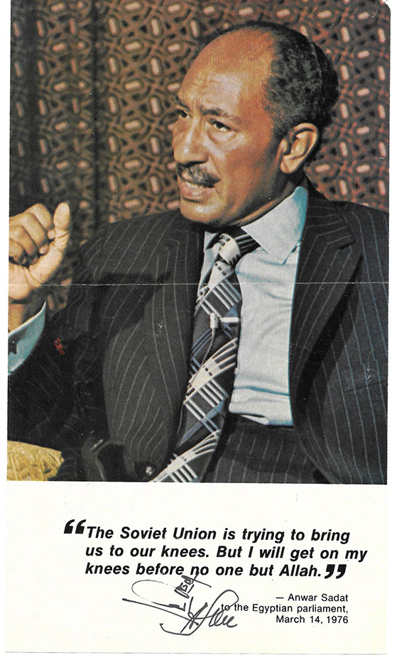 SADAT, Anwar (1918-1981). Third President of Egypt (1970-1981). Vice-President and Prime Minister of Egypt. As President he led Egypt into the Yom Kipper War of 1973. He became a hero in Egypt. He won a Noble Peace Prize making him the first Muslim Nobel Laureate. Awarded the U.S. Congressional Gold Medal. Assassinated on October 6, 1981. Wonderful color magazine portrait, 5”x9”, half length pose. On the bottom margin is printed: “The Soviet Union is trying to bring us to our knees. But I will get on my knees before no one but Allah.” Boldly signed with a double signature, one in English, the other in Arabic.” One mailing fold otherwise in very good condition................$350.00