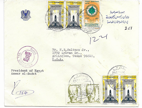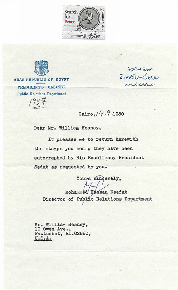 SADAT, Anwar (1918-1981) President of Egypt, assassinated. In March 1978, an Egyptian-Israeli Peace Treaty was signed in Washington. Sadat and Begin were jointly awarded the 1978 Nobel Peace Prize. Choice U.S. Search for Peace 5 cent postage stamp hand signed in ink with a double signature of Anwar Sadat. Together with a letter of transmittal from his Director of Public Relations (Cairo 1980) and the original envelope................$275.00