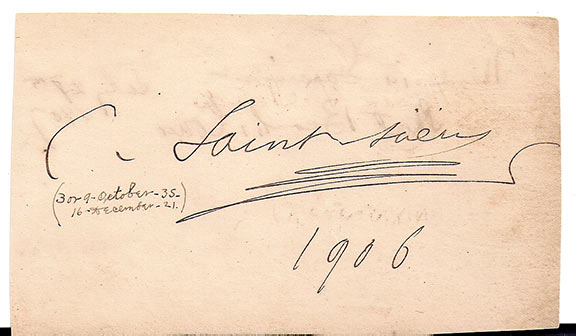 SAINT-SAENS, Camille (1835-1921). French composer and organist. Signature, dated “1906” on a portion of an album page. Some dates below the signature by another hand.....................................SOLD