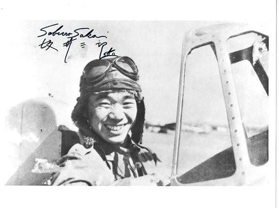 Said to be Japan’s Most Famous Pilot SAKAI, Saburo (1916-2000). Japanese Naval Pilot during WWII. Ace, credited with 64 victories. At one time he chased two B-26’s. He shot one down the other was hit but got away. Later he learned that the B-26 that got away was carrying Lyndon B. Johnson. Photograph, B&W, head and shoulders pose sitting in a cockpit. He signed this photo in the light area of the sky with a double signature, once in English and again in Japanese. Choice........$250.00 |