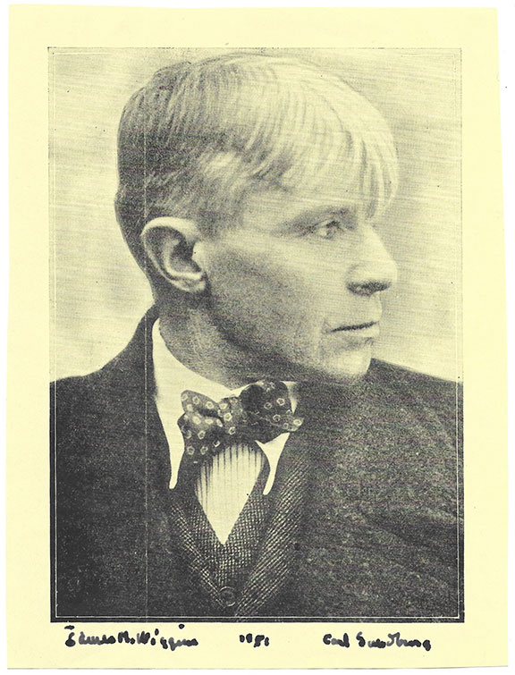 SANDBURG, Carl (1878-1967) American poet, biographer, journalist, and editor. Winner of 3 Pulitzer Prizes. Possibly best remembered for his biography of Abraham Lincoln. Printed portrait, head & shoulders profile pose, measures 5”x6.” Inscribed and signed on the lower light border: “To James Wiggins, 1951, Carl Sandburg.” In V/G condition.........$165.00