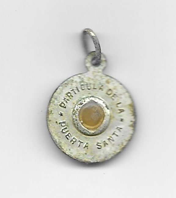 SANTIAGO ( - 44A.D.) Patron of Spain. Brother of the Apostle John who belongs to the group of disciples closest to Jesus and was one of the first martyrs of the Catholic Church. Jesus convinced him to join his group of 12 Apostles. Santiago was the first Apostle to die. Rare medal bears a raised portrait of Santiago with the words Santiago Apostle. On the verso reads “Particula De La Santa.” In the center of the medal on the reverse is housed what appears to be a piece of cloth. This medal/relic is very old yet in good condition. A little ring affixed to the top for a chain. About the size of a U.S. dime. Most unusual.....................$175.00