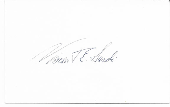 SARDI, Vincent (1885-19690. New York restaurateur. In 1927 founded “Sardis” This was known as “The Celebrity Hangout.” He covered the walls with celebrity caricatures. This attracted New York Cities elite as well as star struck tourists visiting Broadway and the Theaters. A heavy 3.5”x5” card signed in full. Dated on the verso Nov.22,1962. Mint condition......................$45.00![]() |
