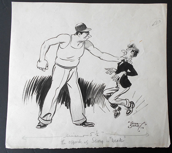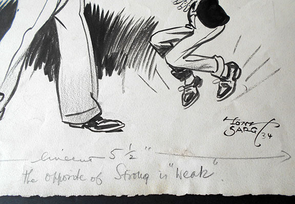 SARG, Tony (Anthony Frederick). (1882-1942. Officer in the German Army until 1905. Began as an illustrator in 1905. Came to the U.S. in 1915. Illustrator of humorous stories for the Saturday Evening Post, Red Book, Collier’s and Cosmopolitan. He was the creator of Tony Sarg’s Marionettes. Creator of monster balloon parades all over the country including the Macy Thanksgiving Parade. Author of over a dozen books of children’s alphabet, animal and trick books. Original wash, black & white, folio, measures appx. 13”x14” of a big thug holding a man with one hand, off the ground. Titled “The Opposite of Strong is Weak.” Boldly signed in full adding the date “(19)34.” In fine condition................SOLD