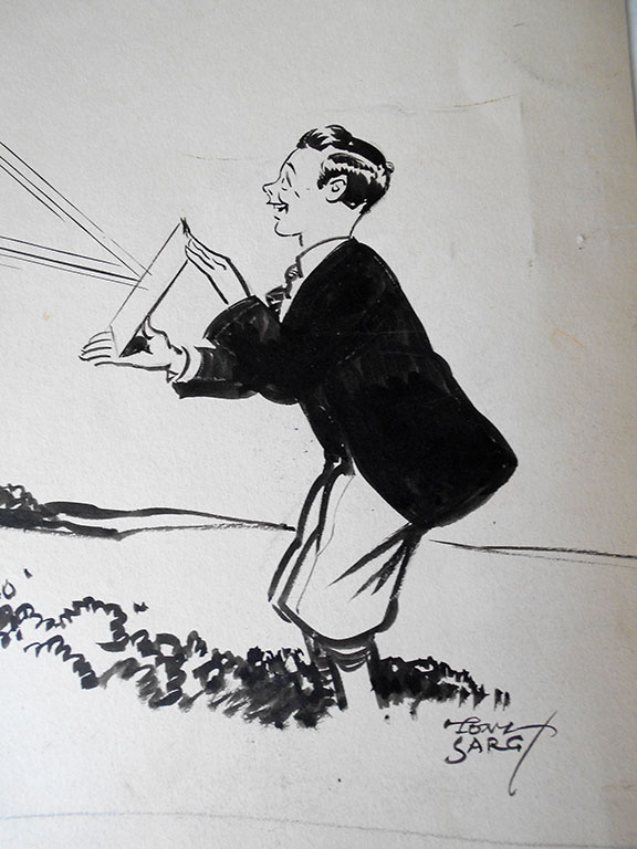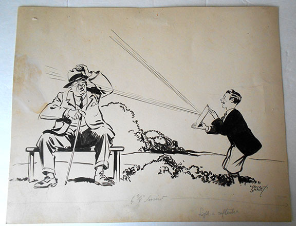 SARG, Tony (1882-1942). Officer in the German Army until 1905. Started illustrating after leaving the Army. Came to the United States in 1915. He illustrated for numerous stories for the Saturday Evening Post, Red Book, Colliers Magazine, Parent’s Magazine and Cosmopolitan. Creator of Tony Sarg’s Marionettes. He created the monster balloon parades all over the United States. Author, illustrator of over a dozen children’s books. Original ink-wash, large size, measures appx. 13x17”. Depicts an old man sitting on a park bench. A young mischievous young boy is holding a reflector towards the sun and deflecting the sun’s rays onto the old man’s face. Boldly signed "Tony Sarg" near the bottom right corner. Light discoloration in the blank area near the old man’s elbow. Titled “Light is Reflected.” Dated on the verso “July 36.”...........SOLD