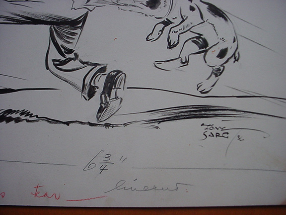 SARG, Tony (1882-1942). Officer in the German Army until 1905. Started illustrating after leaving the Army. Came to the United States in 1915. He illustrated for numerous stories for the Saturday Evening Post, Red Book, Colliers Magazine, Parent’s Magazine and Cosmopolitan. Creator of Tony Sarg’s Marionettes. He created the monster balloon parades all over the United States. Author, illustrator of over a dozen children’s books. Original ink-wash for Parent’s Magazine. Measures appx. 12x14”. Depicts a man running away from a vicious dog. The dog has grabbed a hold of the man’s pants at the rear, tearing away material. Boldly signed and dated: “Tony Sarg/36”. In very good condition................SOLD