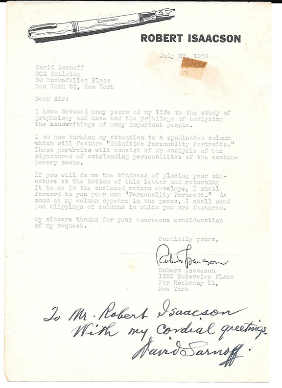 DAVID SARNOFF (1891-1971). He started his career in communications as a messenger for a telegraph company, became proficient enough at Morse code that he was hired as a radio operator for the Marconi Wireless Telegraph Co. On April 14, 1912, the 21-year-old Sarnoff was the first to pick up distress signals from the sinking Titanic; he remained at his post for 72 hours, receiving and passing along news, and was hailed for his dedication. In 1921, he became general manager of the newly-formed Radio Corporation of America, and attracted national interest when he broadcast a bout between Jack Dempsey and Georges Carpentier on July 2, 1921. In 1926, Sarnoff founded the National Broadcasting Company (NBC), and established an experimental television station two years later; his television was demonstrated at the New York World's Fair in 1939. During World War II, Sarnoff, who had been made President of RCA in 1930, served as a communications consultant to Dwight D. Eisenhower, and was promoted to the rank of Brigadier General. In 1947, he became chairman of the board of RCA, serving until his retirement in 1970.Typed letter from Robert Isaacson to David Sarnoff, July 27, 1959. Isaacson writes in part: “I have devoted many years of my life to the study of graphology and have had the privilege of analyzing the handwritings of many important people. I am now turning my attention to a syndicated column which will feature “Intuitive Personality Portraits.” These portraits will consist of an analysis of the signatures of outstanding personalities of the contemporary scene. If you will do me the kindness of placing your signature at the bottom of this letter….” David Sarnoff has complied with the writers request by inscribing and adding a four word sentiment along with his very bold signature...........$125.00