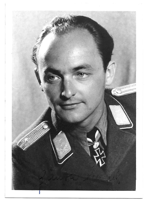 SCHACK, Hauptmann Gunther (1917-2003). German fighter pilot during WWII. Flew with the JG-3. Ace credited with 174 victories. Awarded the Knight’s Cross with Oak Leaves. Photograph, 3.5”x5”, B&W, head and shoulders pose in uniform. Signed with a full signature on the dark portion of the photograph offering fair contrast...........$37.50