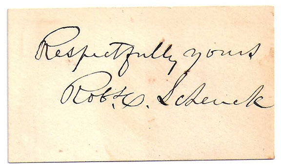 SCHENCK, Robert C. (1809-1890). Union General who led the VIII Corps. His Corps played a major role in the early stages of the Gettysburg campaign. Wounded at Manassas. Congressman. He wrote the rules for draw poker. Two word sentiment, signed on a card................SOLD