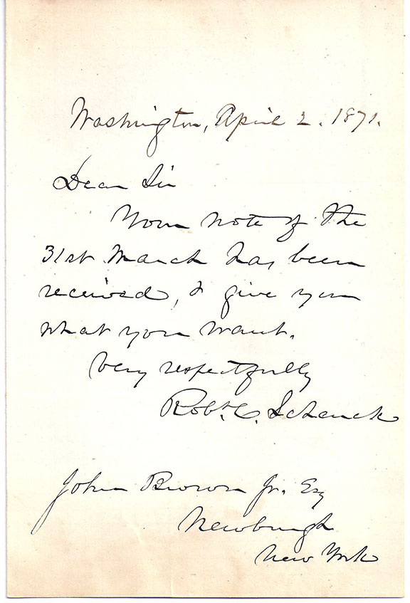 SCHENCK, Robert C. (1809-1890). Union General. Autograph letter signed, one full page. Washington, DC 4/2/1871. To John Brown, Jr. Most likely responding to a request for his autograph. A nice clean example with ample margins.... $150.00 |