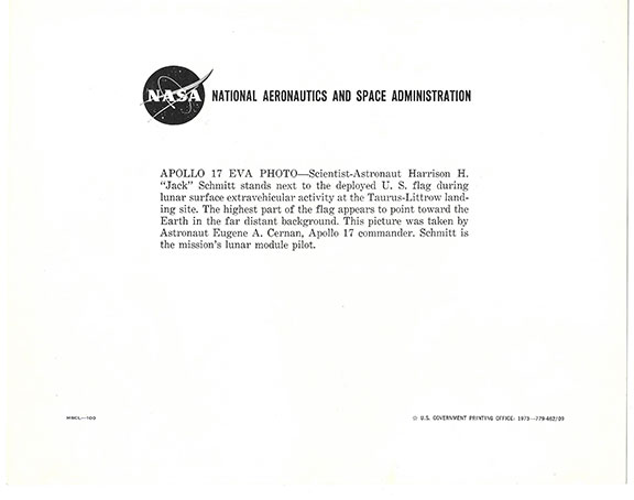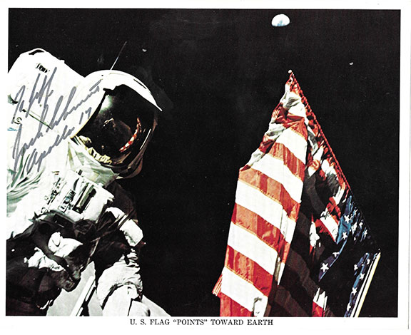SCHMITT, Harrison (1935- ) Apollo 17 was the last of the Apollo missions to the moon. Schmitt was the 12th person to walk on the moon. Choice official NASA color portrait of Schmitt in his white space suit, holding the American Flag which is pointing towards earth. Inscribed and signed by Schmitt’s hand: “To Jeff Jack Schmitt, Apollo 17.” The reverse bears the Official NASA logo, National Aeronautics and Space Administration and a short biography of Harrison Schmitt. Not a common portrait. In very fine condition.................$450.00