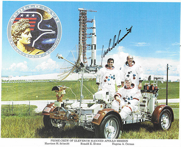 SCHMITT, Harrison (1935- ). Flew on the last manned mission to the moon. Eleventh astronaut to walk on the moon. Lunar Module pilot of Apollo 17. United States Senator representing NEW Mexico. Official NASA color photograph of the crew of Apollo 17. Boldly signed “Jack Schmitt”. In excellent condition.....$285.00![]() |