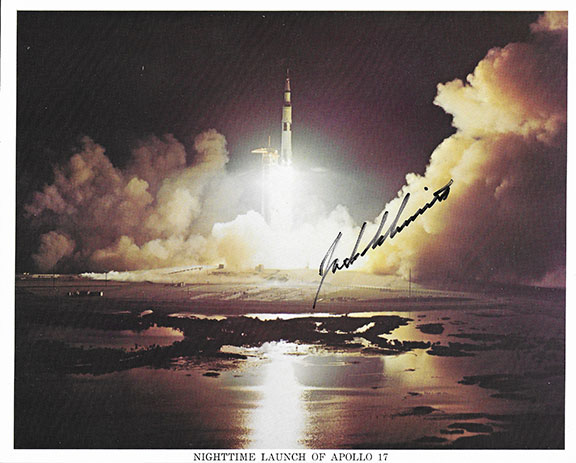 SCHMITT, Harrison (1935- ). Flew on the last manned mission to the moon. Eleventh astronaut to walk on the moon. Lunar Module pilot of Apollo 17. United States Senator representing New Mexico. Official NASA color lithograph of the nighttime launch of Apollo 17. Very boldly signed: “Jack Schmitt” in the clear portion of the blastoff. Very fine condition......................$295.00![]() |