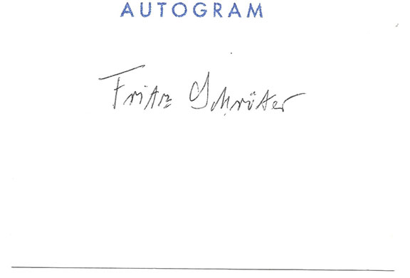 SCHROTER, Fritz (1912-2009) German fighter pilot in WWII. Ace credited with 50 victories. Court martialed and jailed. On a 3”x4” card with the printed word “Autogram” at the op the Ace has signed his name in full. Not common.......$45.00 |
