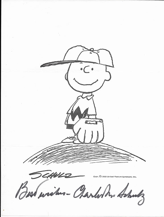 SCHULZ, Charles (1922-2000). American comic-strip artist. Creator of the extremely popular comic strip Peanuts. A fabulous print, B&W, 8”x11’, B&W, copyright 1950 of Charlie Brown standing on the mound dressed in a baseball uniform along with a glove Signed in print “Schulz” Below hand signed “Best wishes - Charles M. Schulz.” In excellent condition.......................SOLD![]() ![]() |