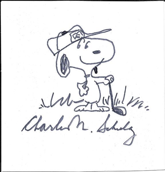 SCHULZ, Charles (1922-2000). American cartoonist, best noted for creating the popular comic strip “Peanuts”. Original sketch of “Snoopy” as a golfer on a heavy stock board measuring 8.5”x8.5”. Snoopy is smiling and holding a golf club in the grass. Very boldly drawn and signed. Would look fabulous framed...............SOLD |