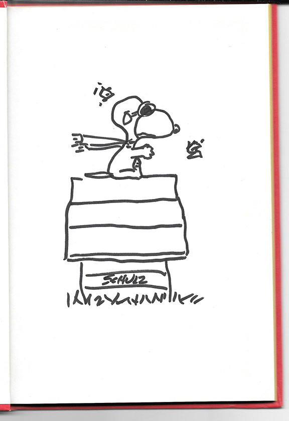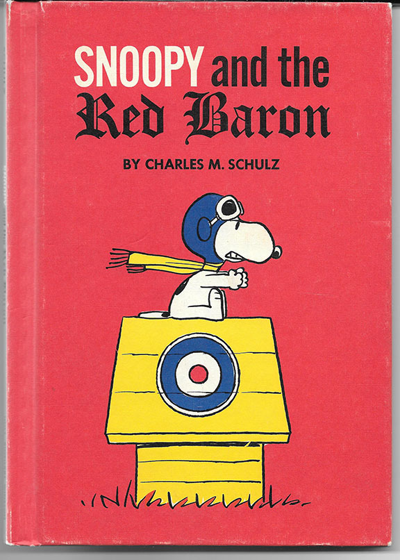 SCHULZ, Charles M. (1922-2000). American comic-strip artist. Creator of the very popular comic strip “Peanuts.” His very desirable book: “Snoopy and the Red Baron.” Holt, Rinehart and Winston, published September 1966, Weekly Reader Children’s Book Club Edition. Heavily illustrated, hardcover. On the front free endpaper is a wonderful sketch of Snoopy dressed in his flight gear of scarf and goggles sitting atop of his dog house. Signed “Schulz”. One of the most desirable Schulz sketches. In V/G condition.................................SOLD